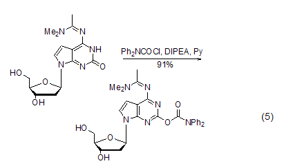 用作寡聚核苷酸合成時(shí)的保護(hù)基 在合成寡聚核苷酸時(shí),鳥(niǎo)嘌呤核苷的堿基容易發(fā)生副反應(yīng),需要加以保護(hù),dpc-cl可以將鳥(niǎo)嘌呤堿基的烯醇異構(gòu)體?;鴮?duì)其進(jìn)行保護(hù),這種方法在合成具有鳥(niǎo)嘌呤堿基和與鳥(niǎo)嘌呤堿基類似的核苷化合物時(shí)[9~12],發(fā)揮著重要作用 (式5)。